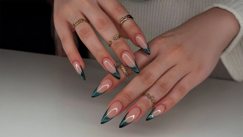 French nails keep a clean base with a defined tip. Classic is sheer pink or nude with a white arc, but the look is wide open. Try micro French, deep smile lines, side or V tips, double lines, reverse French, or a thin outline around the nail. Techs paint by hand, use gel liners or striping tape, or airbrush the edge. Works on any length and suits almond, oval, square, and coffin shapes. Finish glossy or velvet matte. For fall, swap white for wine, espresso, hunter green, navy, chocolate, or chrome. Add a tiny crystal, a blush aura base, or a subtle contour to sharpen the shape.