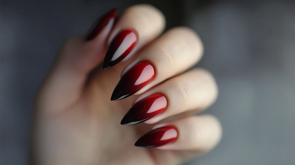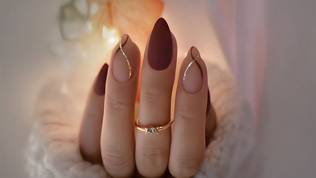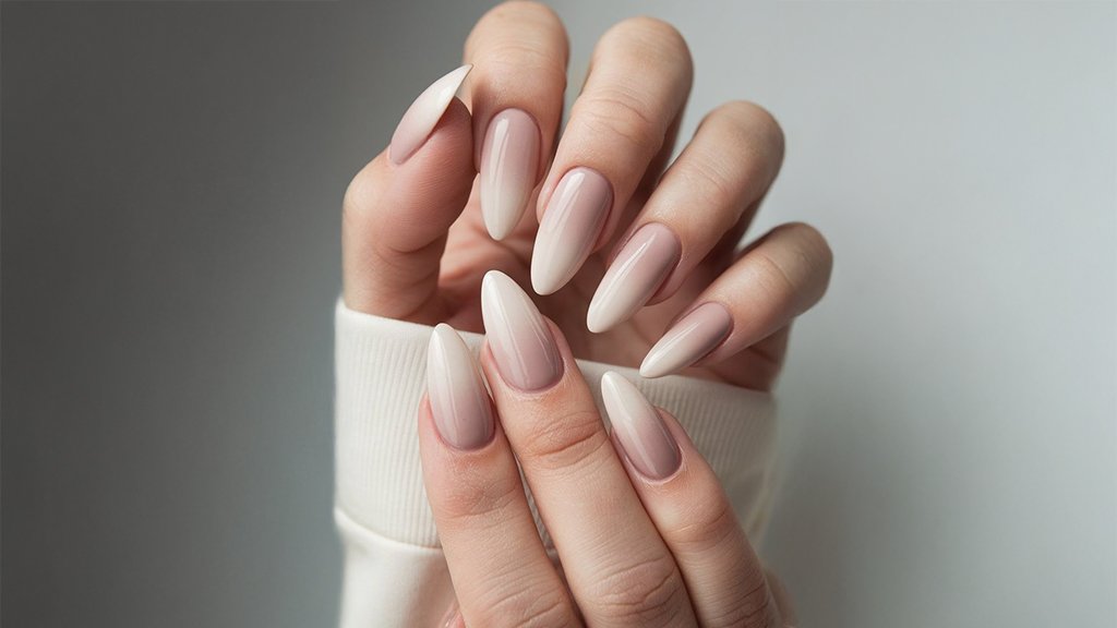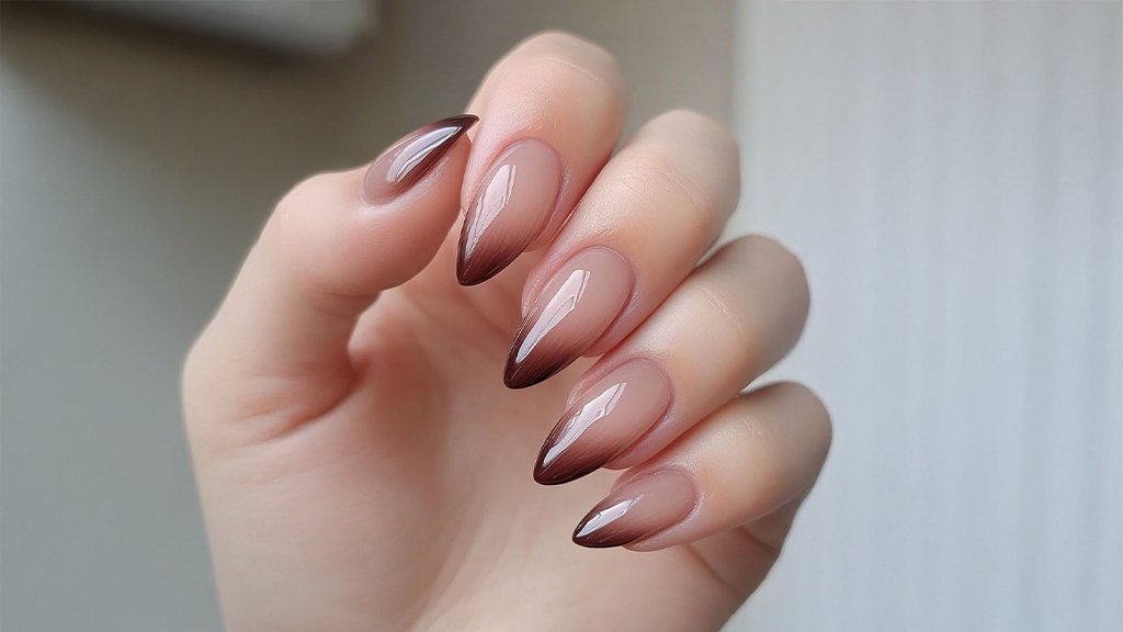 Ombre blends one shade into another so the color shifts softly from base to tip. Techs sponge or airbrush the gradient over gel, then seal with a glossy or velvet matte top coat. It works on any length and suits almond and oval best. You can go nude to color or color to color. For fall, try wine into black, cocoa into latte, taupe into cream, lilac haze into pink, moss into sage, or caramel into ivory. Add a thin French edge, a chrome mist, or a tiny crystal if you want a little detail.